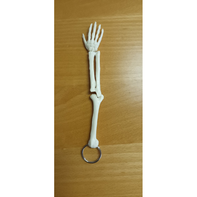 Zeer groot formaat sleutelhanger van een armskelet, inclusief spaakbeen, ellepijp en opperarmbeen. Het ellebooggewricht en polsgewricht is buigzaam.