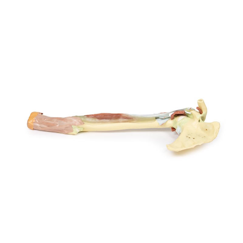 Dit 3D-geprinte exemplaar toont de oorsprong en aanhechting van de biceps (de meeste andere arm- en schouderspierbuiken zijn verwijderd). De lange kop van de biceps komt voort uit de tuberculum supraglenoidale (verborgen) en beweegt inferieur in de bicipitale groef, terwijl de korte kop van de biceps voortkomt uit het processus coracoideus. De gespleten aanhechting van de spier, de bicipitale aponeurose en de afgeronde pees die zich rond de radius wikkelt om in de tuberositas radius te steken, zijn duidelijk te onderscheiden.