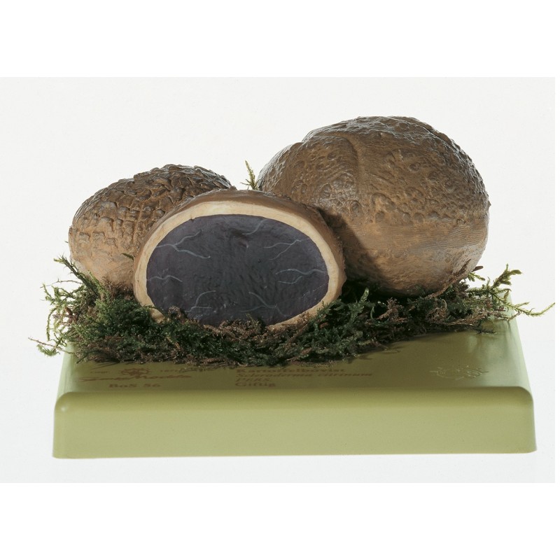 Model van de gele aardappelbovist (Scleroderma citrinum). Dit model bevat drie exemplaren van deze giftige paddenstoel. Een van de bovisten is opengesneden, waardoor de purperzwarte sporenmassa zichtbaar wordt.