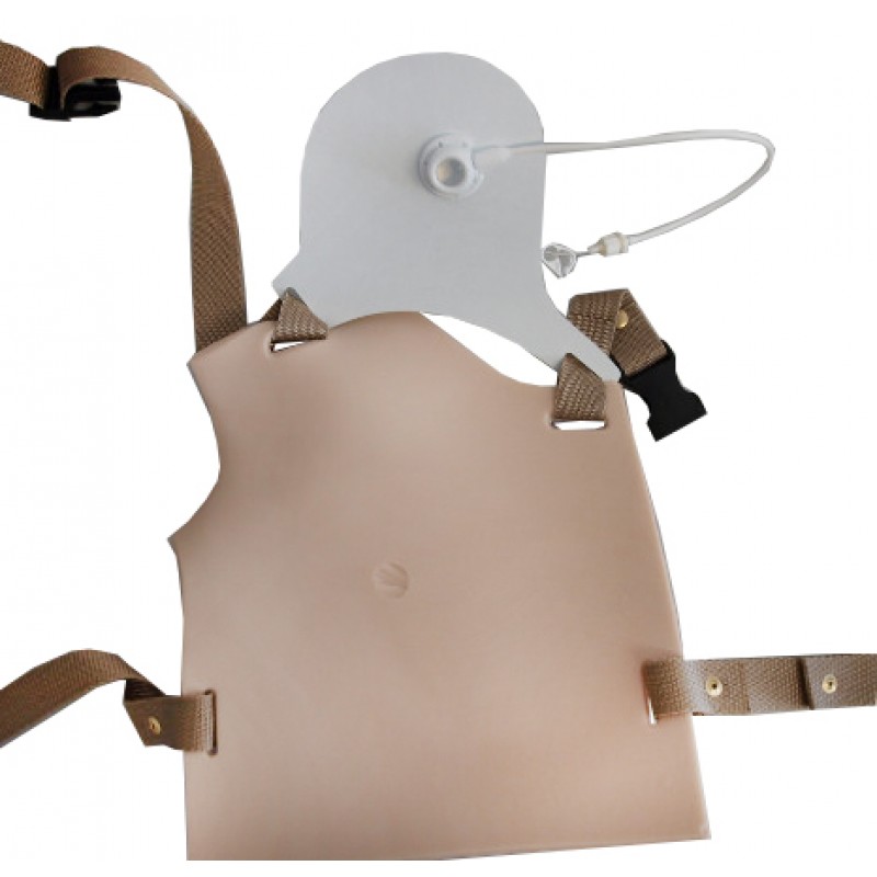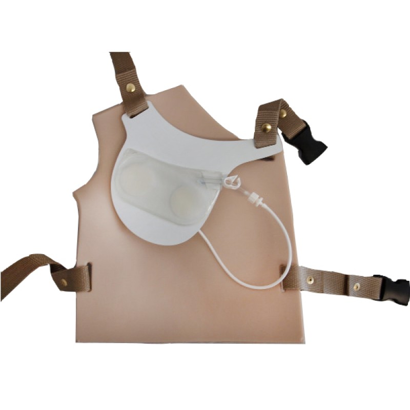 Het oefenmodel wordt met verstelbare bandjes om de nek en het middel vastgehouden. Hiermee kunt u zorgprocedures oefenen op een geïmplanteerde poortkatheter, ook wel port-a-cath genoemd. Het feit dat de persoon het oefenmodel kan dragen vergroot het realisme van de training aanzienlijk, omdat het de mogelijkheid toevoegt om met de “patiënt” te praten en zijn bewegingen en ademhaling te voelen.